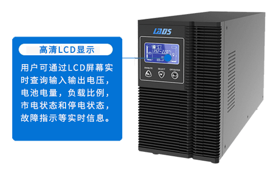 用戶可通過LCD屏幕實(shí)時(shí)查詢輸入輸出電壓,電池電量,負(fù)載比例,市電狀態(tài)和停電狀態(tài),故障指示等實(shí)時(shí)信息。