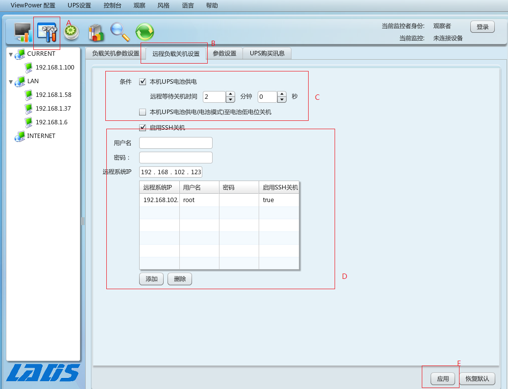 2、如果要在交流故障時(shí)關(guān)閉ESXi,請(qǐng)轉(zhuǎn)到UPS設(shè)置 》遠(yuǎn)程關(guān)機(jī)頁面,請(qǐng)參考A和B部分。然后選擇關(guān)機(jī)條件,并設(shè)置關(guān)機(jī)時(shí)間,參考C部分,并將ESXi服務(wù)器IP地址添加到IP列表,參考D.的部分。最后單擊“應(yīng)用”按鈕保存配置。